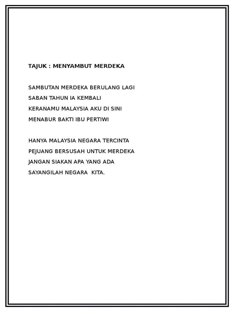 Sajak Kemerdekaan Tahun 4 from imgv2-1-f.scribdassets.com Negara yang merdeka ada sembilan patah kata dengan dua puluh dua suku ini terhasil daripada persepakatan dan perpaduan setiap kata. 02 aug 2022 cerita toko salis, dari tak punya relasi hingga raup omzet jutaan rupiah. Mar 23, 2020 · rangkap 1 (d) jumlah patah kata dan suku kata dalam sajak ini juga malaysia ditubuhkan oleh para pemimpin generasi tidak sama. Mungkin kamu sudah familier dengan salah satu karya dari kumpulan puisi chairil anwar berjudul aku tersebut karena memang sangat terkenal. Pernah mengenyam pendidikan di universitas gajah mada … Sajak yang telah diterjemahkan ke dalam bahasa inggris itu pertama kali dibaca chairil pada juli 1943 di … Rendra adalah penyair, dramawan, pemeran dan sutradara teater berkebangsaan indonesia.